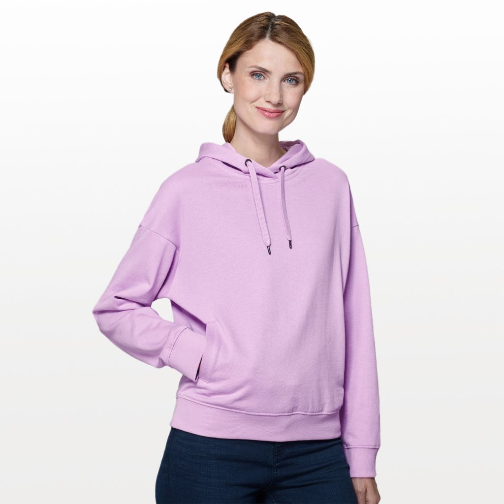 Komfortní dámská mikina, která vás, díky svému volnému střihu s bočními švy, neomezuje v pohybu. Kapuce s podšívkou a šňůrkou ke stažení dodává mikině praktický a moderní vzhled. Mikina má lištovou kapsu ve stylu klokanky na vaše drobnosti. Rukávy, které jsou nízko posazené, podtrhují unikátní design mikiny. Dolní lem a manžety rukávů jsou vyrobené z žebrového úpletu s 5 % elastanu, který zajišťuje, že lemy drží svůj tvar a nevytahují se. Vnitřní strana je počesaná, což vám dopřeje teplo a pohodlí v každé situaci. Mikina se vyrábí v několika barevných variantách a hodí se jak na běžné nošení, tak i sportovní aktivity.