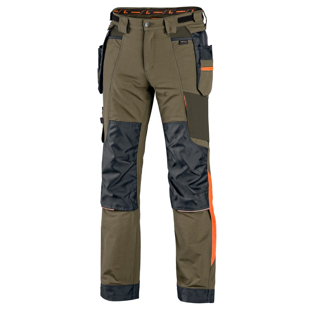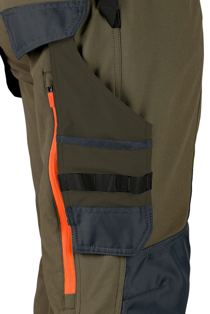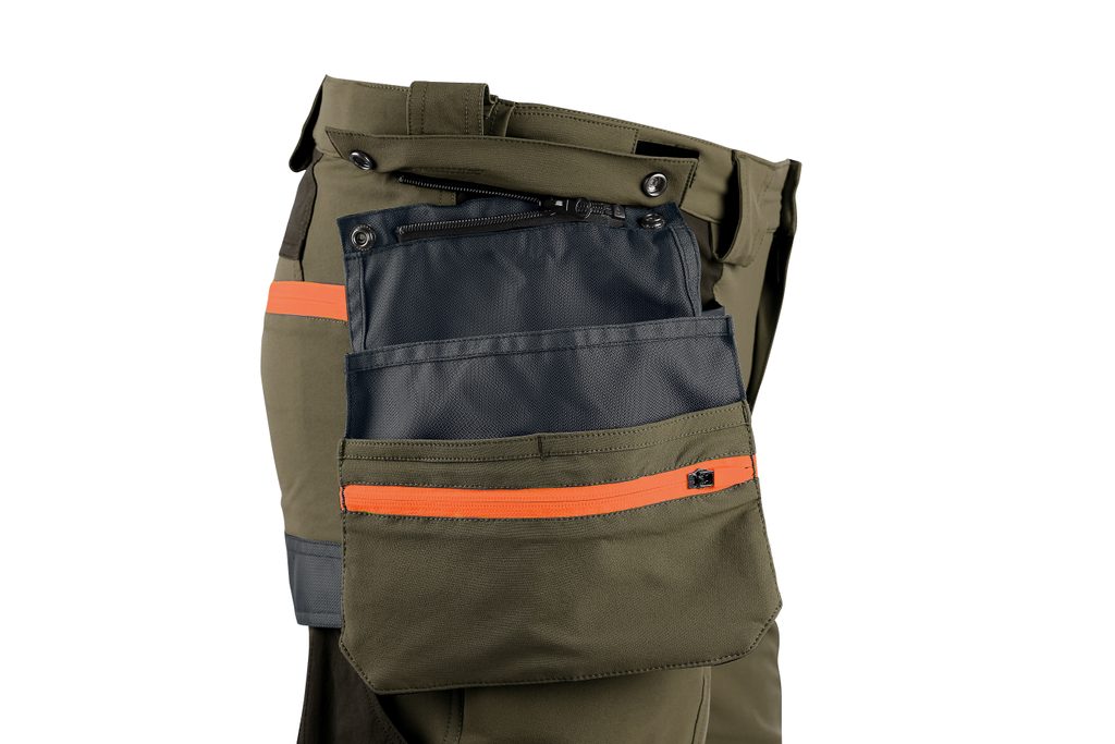 Moderní pánské montérkové kalhoty vyrobené z kvalitního a velmi pružného materiálu 4-way stretch s vysokým obsahem nylonu, který zaručuje rychlé schnutí. Díky tomuto inovativnímu materiálu, který umožňuje roztažení do všech čtyřech směrů, se budete moct snadno a volně pohybovat při každé práci. Kalhoty mají stylový užší střih, flexibilní pas s možností upravení velikosti a poutky na opasek, zipové větrání v zadní části stehen a několik funkčních kapes - 2 přední, 2 zadní ve spodní části a 2 odnímatelné kapsy na nářadí zesílené materiálem CORDURA, kapsa na zip na stehně, multifunkční boční kapsa. Materiálem CORUDRA je zesílená i spodní část nohavic a kolena, do kterých se dají navíc vložit kolenní výztuhy. Pro lepší viditelnost a tím i větší bezpečnost při práci jsou kalhoty vybaveny také reflexními doplňky.