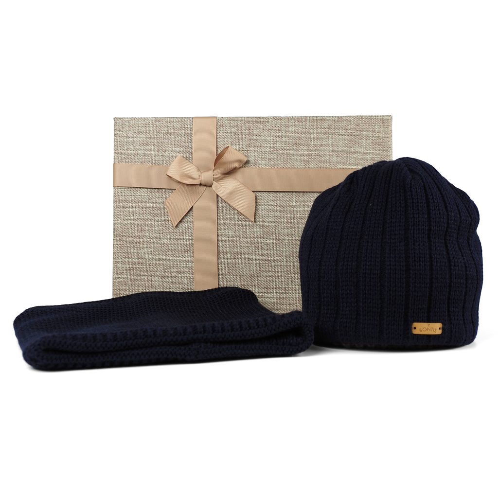 Čepici můžete zakoupit také v dárkové sadě s pleteným nákrčníkem v elegantní dárkové krabici.
