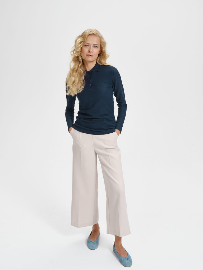 Příjemná dámská polokošile s dlouhým rukávem má elegantní a pohodlný střih, který je lehce vypasovaný pro zvýraznění dámské siluety. Ramenní švy jsou zpevněné páskou, aby polokošile dobře držela tvar a vnitřní průrčník je začištěný páskou z vrchového materiálu. Úzká léga se zapíná na 4 knoflíčky v  barvě materiálu. Límeček z žebrového úpletu je ozdobený dvojitým reliéfním proužkem.