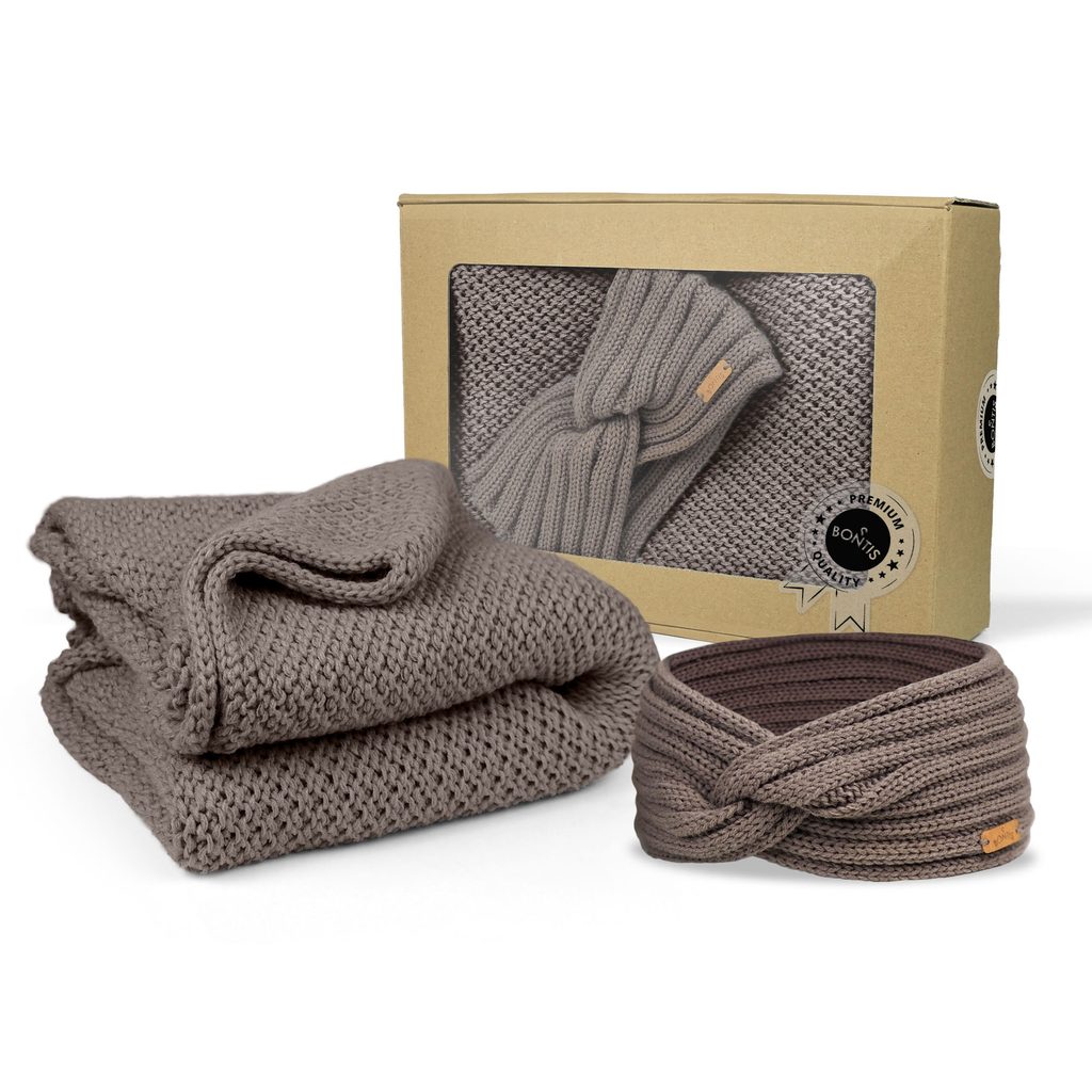 Dárkový set, který je spojením luxusu se zimním pohodlím - pletený kardigan a překřížená čelenka ve stejném barevném provedení.